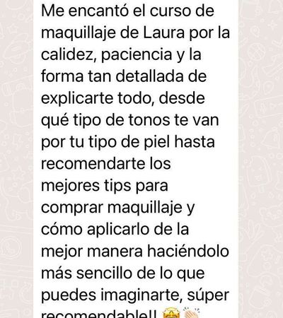 Este curso de automaquillaje con Laura Fariñas es una elección ideal para quienes buscan potenciar su belleza y confianza. Dirigido a entusiastas del maquillaje, profesionales de la belleza y mujeres emprendedoras, ofrece técnicas avanzadas, teoría de color y consejos para resaltar la individualidad de cada persona. Para los amantes del maquillaje, es una oportunidad de aprender a crear looks impresionantes. Los profesionales de la belleza pueden mejorar sus habilidades y negocios, mientras que las mujeres emprendedoras pueden aumentar su confianza en línea.